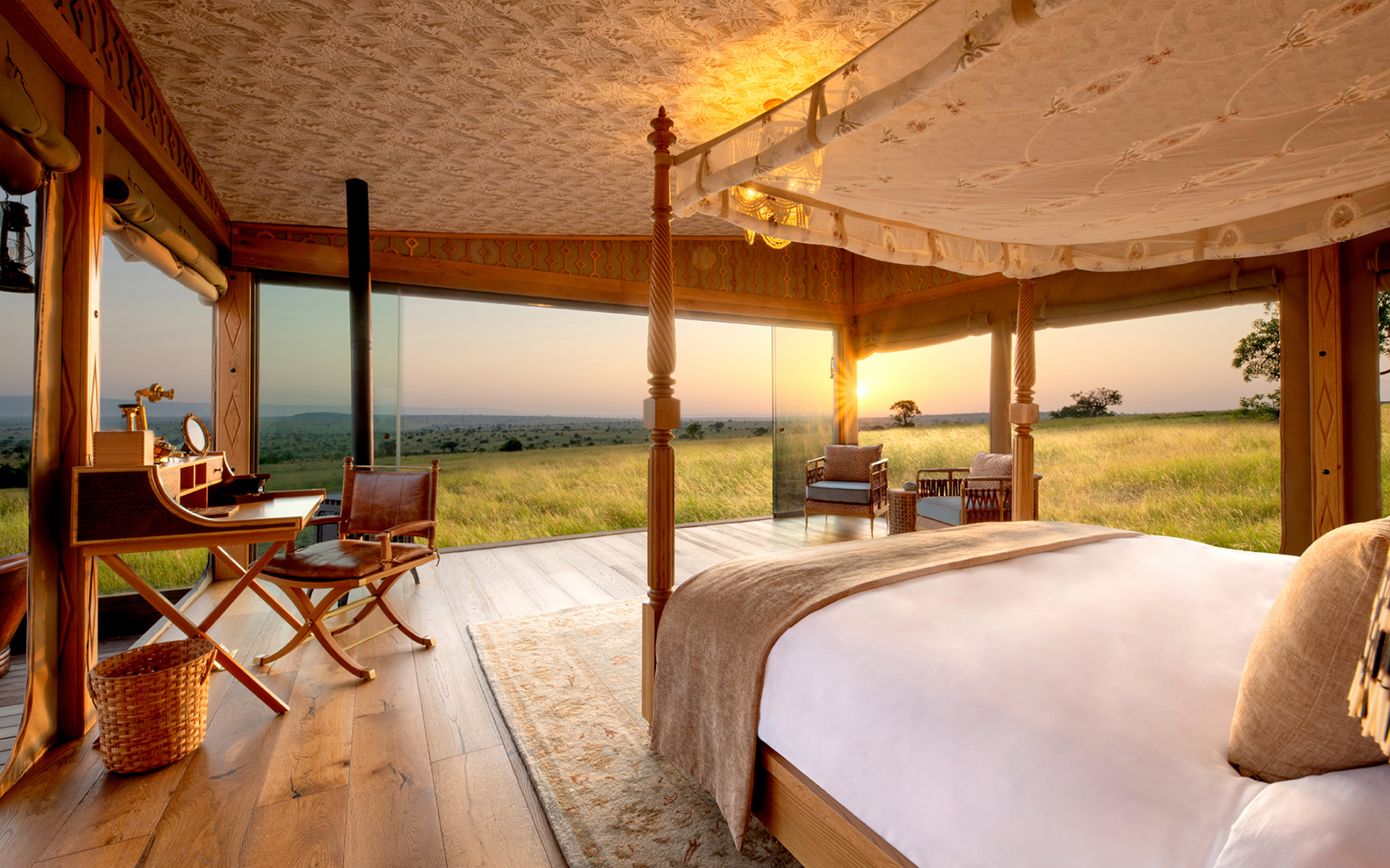 Arrive at your luxury honeymoon tent, designed for privacy, romance, and comfort. Each tent features a private deck overlooking the plains, an open-air lounge, and en-suite amenities. After settling in, enjoy a delicious gourmet lunch prepared with fresh, local ingredients. Spend the early afternoon relaxing, taking in the views, or sharing quiet moments together with champagne on your deck.
